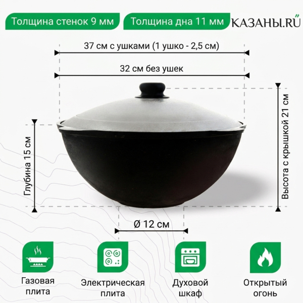 Имеет алюминиевую крышку плотного прилегания. Для переноски предусмотрены 4 литые ручки, выполненные в форме «ушек». Равномерная по всей окружности толщина 6-миллиметровых стенок гарантирует оптимальное распределение тепла, которое очень важно для приготовления настоящего узбекского плова и всех других восточных блюд. Способен поддерживать температуру на протяжении длительного времени после снятия с огня.