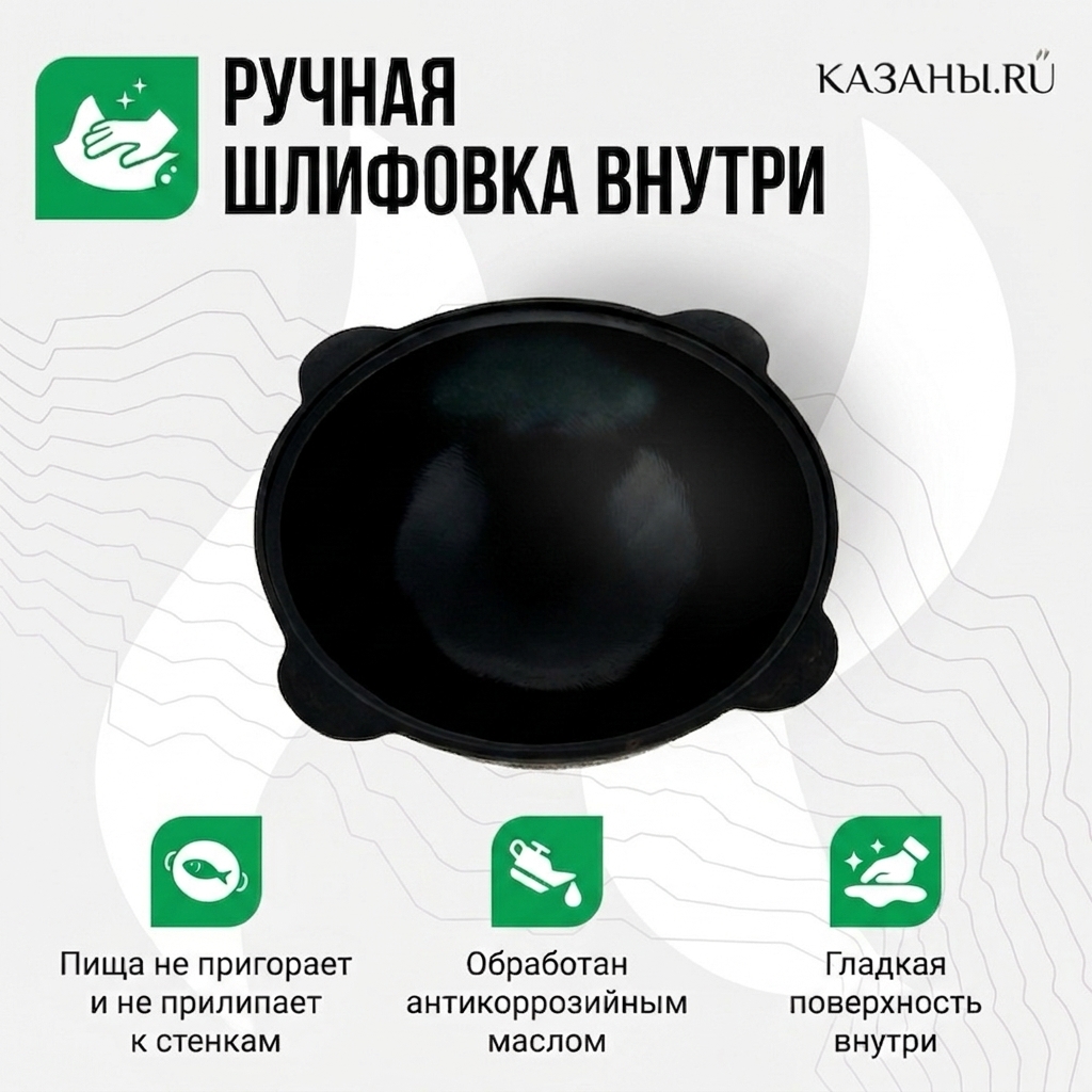 Как и все классические узбекские казаны, имеет толстые стенки (6 мм), благодаря которым любимые блюда не подгорают, а медленно тушатся в масле, чесноке и специях, напитываясь их удивительными ароматами. При этом уникальные антипригарные свойства чугуна дают возможность готовить пищу по традиционным рецептам на протяжении нескольких часов, практически не перемешивая ингредиенты и не нарушая их целостность. Ещё одна причина, по которой блюда из чугунного казана получаются вкусными и ароматными – продуманная форма и равномерная толщина стенок по всей окружности.