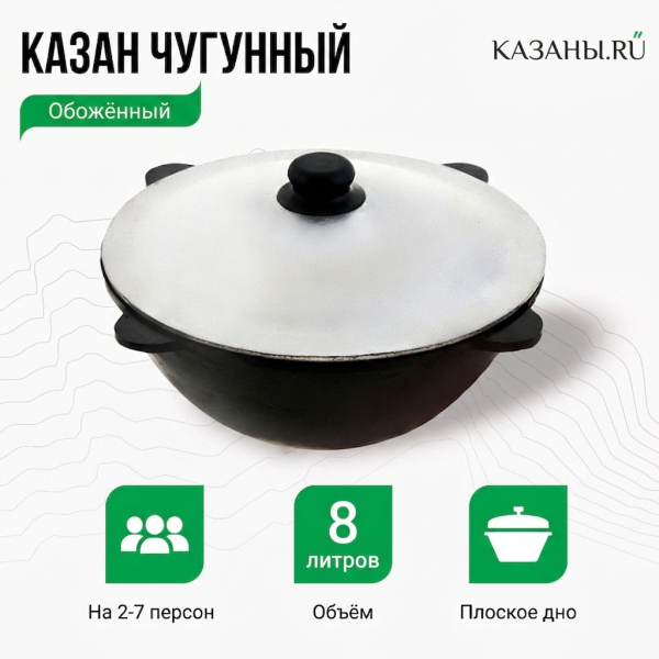 8-литровый чугунный казан с плоским дном – прекрасное решение для дома или дачи. Благодаря универсальной конструкции, такой казан можно без особых проблем разместить в специальной печи, на мангале, на подставке-треноге, а также на обычной домашней плите, в духовке или духовом шкафу. Имеет алюминиевую крышку стандартной формы с ручкой, которая очень плотно закрывает казан, располагаясь в специальном углублении. Плоское дно обеспечивает такой посуде высокую устойчивость. Для переноски имеются четыре ручки цельнолитой конструкции.