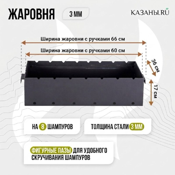 По умолчанию мангал изготовлен из высококачественной стали толщиной 3 мм (все швы сварены, дно и стенки также 3 мм). Дополнительно можно усилить мангал до 5 мм, а также оснастить его зольными ящиками. Последние необходимы для более точного контроля притока кислорода к углям, что облегчает процесс приготовления пищи. При среднем использовании срок службы мангала из стали толщиной 3 мм составляет около 6–7 лет, а при усилении до 5 мм — не менее 10 лет.