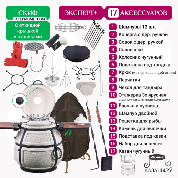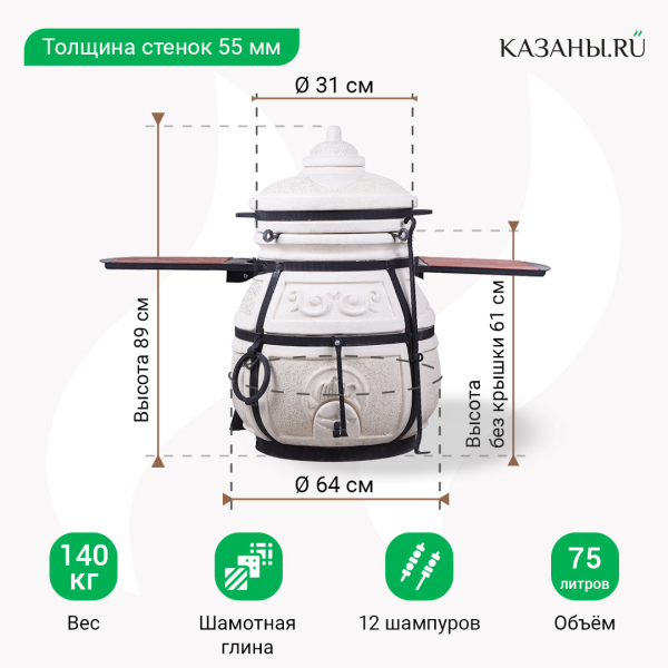 Высота тандыра с крышкой составляет 120 см, без крышки - меньше примерно на 20 см. Диаметр горловины печи - 31 см, общий диаметр - 64 см. Толщина стенок печи - 6 см, это оптимально для камер такого размера. Вес конструкции достигает 125 кг. Вместе с печью в комплекте поставляются 12 шампуров с подставкой для их размещения внутри тандыра, чугунный колосник, кочерга, совок для золы.